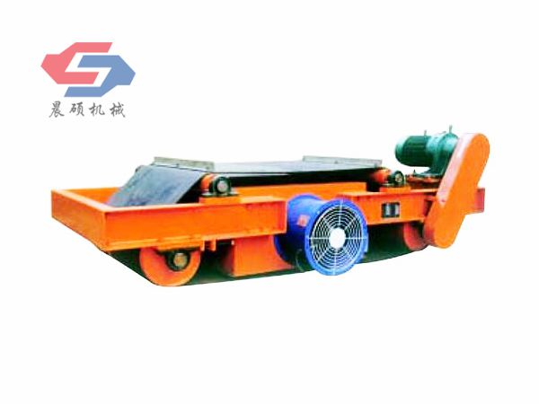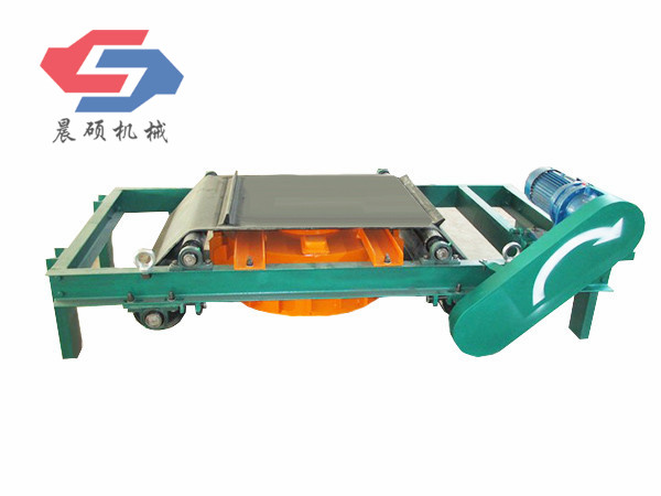 電磁除鐵器的基礎上增加了驅(qū)動電機、滾筒、帶刮板的缷鐵膠帶等組成的缷鐵機構(gòu)。在工作過程